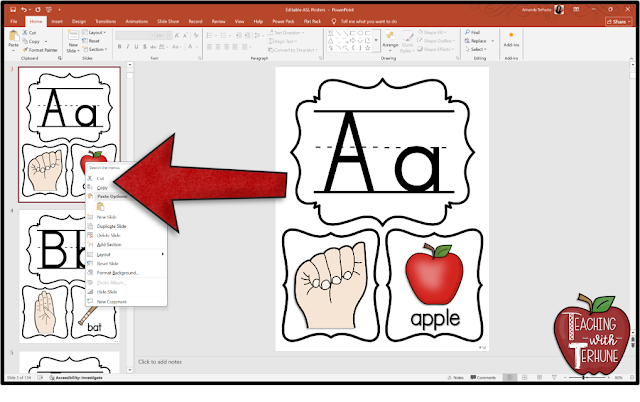 - In the left-hand slide panel, right-click on any letter slide.